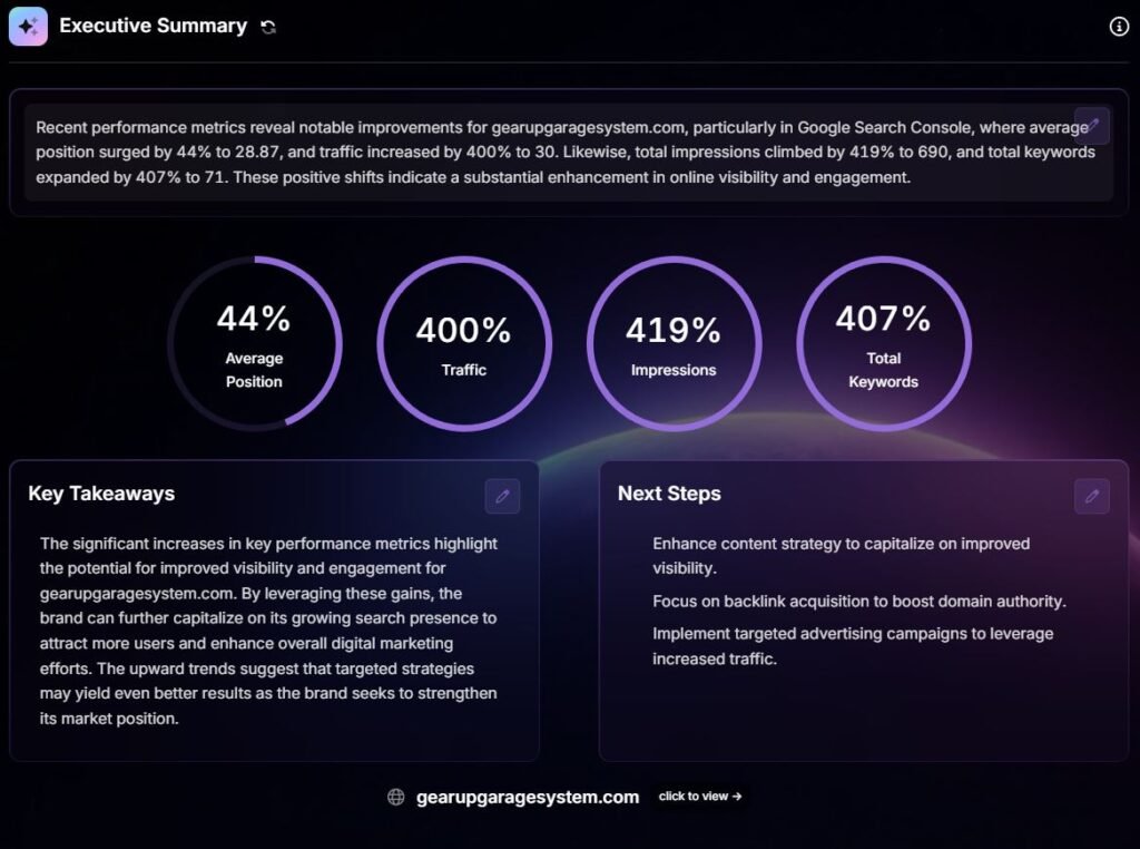 We track traffic, impressions, keyword growth, ranking position, call clicks, and website clicks. Reports are delivered every Monday so you can clearly see progress and movement.